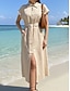Damen Midikleid Kunstbaumwollleinen A Linie Kleid Lässig Täglich Normale Passform Einfach Kurzarm Revers Beige Sommer Frühling