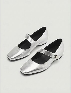 Silberne Mary-Jane-Pumps mit niedrigem Keilabsatz für Damen – minimalistische und bequeme Schuhe für Gartenpartys