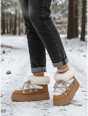 Kamelfarbene Plateau-Schneestiefel für Damen – warme, mit Kunstfell gefütterte Schnürschuhe mit dicker Sohle, bequeme Outdoor-Schuhe für Skiurlaube und Urlaubsoutfits