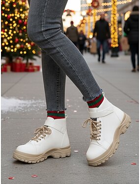 Weiße Schnürstiefeletten für Damen – Winterstiefel mit dicker Sohle, stylisch für Weihnachten, Streetwear und Freizeit.