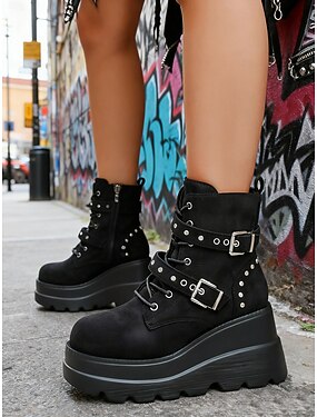 Schwarze Punk-Bikerstiefel für Damen mit Nietenriemen und Schnallen – klobige Schnürstiefel mit Plateausohle für Casual-, Streetwear- und Rockmode