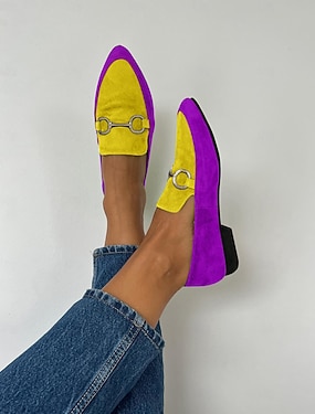 Vibrant gelbe und lila Kunstwildleder-Loafers - Spitz zulaufende Slip-On-Flats mit metallischem Schnallen-Detail für einen schick-lässigen Stil