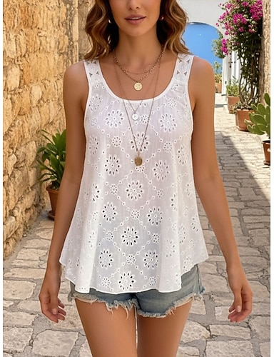 Damen Sommeroberteile Bluse Oberteil mit Ösen Gerafft Patchwork Bestickt Einfach Elegant Vintage Damen Ärmellos Quadrathals Normale Oberteile Täglich Arbeit Ferien Weiß Sommer Frühling