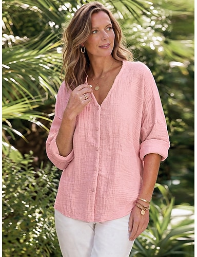 Damen Bluse Baumwollhemd Einfarbig Täglich Stilvoll Basic Langarm V Ausschnitt Normale Oberteile Täglich Blau Weiß Gelb Rosa Grün Sommer Frühling Herbst