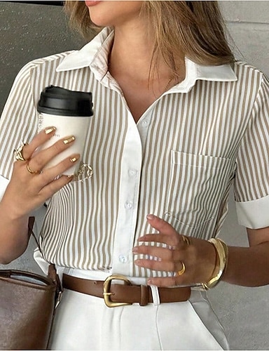 Damen Freizeithemd Knopfhemd Bluse Tasche Knöpfe Gestreift Täglich Stilvoll Lässig Kurzarm Umlegekragen Normale Oberteile Ferien Strandbekleidung Urlaubskleidung Blau Wein Grün Khaki Sommer Frühling