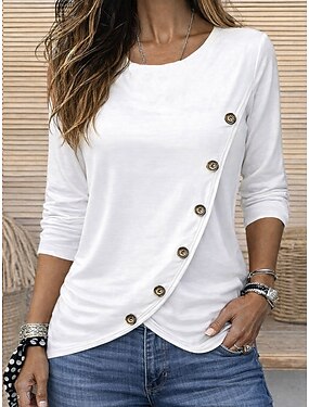 Damen T-Shirt Einfarbig Stilvoll Lässig Langarm V-Ausschnitt Normale Oberteile Täglich Knöpfe Blau Schwarz Weiß Wein Armeegrün Sommer Frühling Herbst
