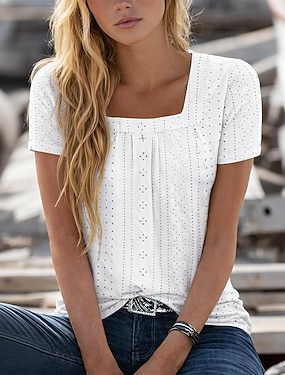 Damen T Shirt T-Shirt Lochmuster Einfach Mode Stilvoll Klassisch Kurzarm Quadrathals Normale Oberteile Lange Oberteile Täglich Ausgehen Wochenende Blau Purpur Sommer Frühling