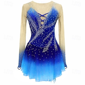 Eiskunstlaufkleid Damen Mädchen Eislaufen Kleider Blau+Hellblau Patchwork Daumenloch Gitter Spandex elastisch Ausbildung Praxis Professionell Eiskunstlaufkleidung Kristalle Langarm Eiskundstlauf