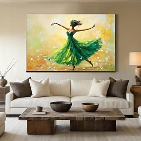 Ölgemälde, handgemalt: Elegante Tänzerin im grünen Kleid, abstraktes Porträt, große Leinwand, moderne Wandmalerei, Spachteltechnik, Impasto-Technik, Wohnzimmerdekoration