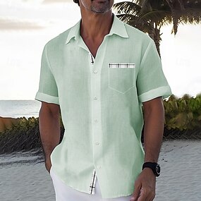 Herren Geometrisch Leinenhemd Sommerhemd Strandhemd Kurzarm Modisch lässig Urlaub Ferien Strandbekleidung Sommer Frühling Umlegekragen Hemden mit Kragen Eine Tasche vorne Rosa Blau Grün