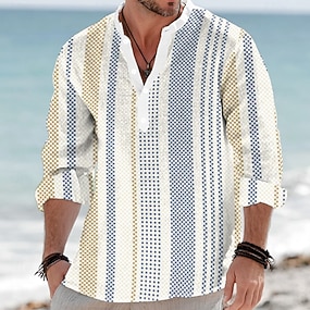 Herren Geometrisch Gestreift Hemd Knopfhemd Henley Hemd Langarm Modisch lässig Urlaub Alltagskleidung Sommer Frühling Mandarinkragen Stehkragen 3D-Druck Leinenähnliches Hemd Blau Gelb