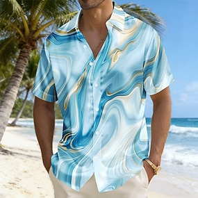 Herren Marmor Farbverlauf Abstrakte flüssige Kunst Hemd Satinhemd Kleidhemd Kurzarm Modisch lässig Täglich Urlaub Sommer Frühling Umlegekragen Hemden mit Kragen 3D-Druck Hemden mit Knopfleiste Blau