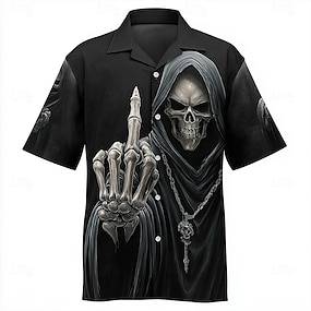 Herren Schädel Sensenmann Mittelfinger Hemd Knopfhemd Camp-Kragenhemd Kurzarm Vintage-Retro Dunkler Gothic-Stil Outdoor Streetwear Sommer Frühling Kubanisches Halsband 3D-Druck Schwarz 1 Schwarz