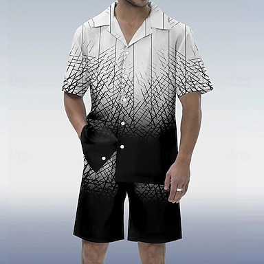 Herren Ombre Linie 2St Hemden-Sets Hemd Kurzarm Kurze Hosen Kubanisches Halsband Urlaub Party Lässig Täglich 3D-Druck Sommer Schwarz