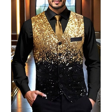 Herren Weste Gilet Urlaub Party Geschäft Mode Lässig Frühling Herbst Tasche Knöpfe Pailletten Polyester Bequem Farbblock Einreihig Ein-Knopf V Ausschnitt Normale Passform Gold Weste