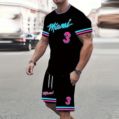 Herren Rose 2St T-Shirts-Sets Kurzarm Kurze Hosen Rundhalsausschnitt Urlaub Lässig Outdoor Urlaub Sport 3D-Druck Sommer Schwarz