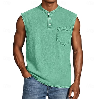 Herren Tank Top Weste Unterhemd Hemd aus 100 % Baumwolle in Säurewaschung Ärmellos Henley Sommer Einfach Mode Designer Basic Tasche Verblasst Knöpfe Lässig Urlaub Straße Blau Schwarz Hellgrün Top