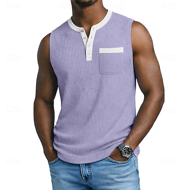 Herren Waffel-Tanktop Unterhemd Ärmelloses Shirt Ärmellos V Ausschnitt Henley Sommer Einfach Texture Mode Klassisch Bequem Farbblock Lässig Fitnessstudio Straße Schwarz Hellgrün Purpur Top T-Shirt