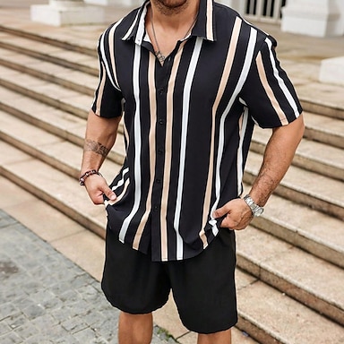 Herren Gestreift 2St Hemden-Sets Sommeroberteile Kurzarm Kurze Hosen Umlegekragen Lässig Outdoor Heim Lässig 3D-Druck Sommer Schwarz
