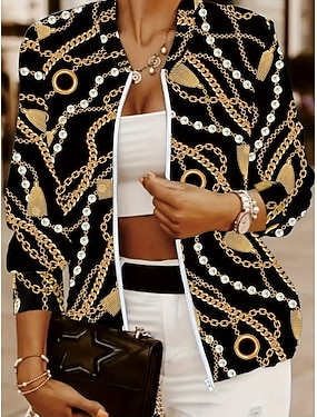 Damen Bomberjacke Bequem Atmungsaktiv Reißverschluss Druck Lässig Geometrisch Urlaub Straße Lässig Alltagskleidung Reisverschluss Kurz Stehkragen Normale Passform Langarm Oberbekleidung Schwarz