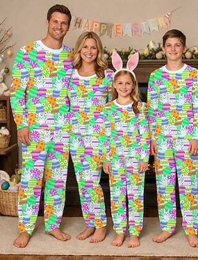 Osterpyjamas für die ganze Familie, grafisches Hasenmotiv, lässig, blau, dunkelgrün, langärmelig, passende Urlaubsoutfits