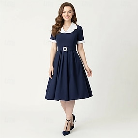 1950er Rockabilly Midlänge Kleid Kurze Ärmel Mit Gürtel Tupfen A-Linie Umlegekragen Kostüm Damen Lässig Alltagskleidung Teegesellschaft Erwachsene Kleid Frühling & Sommer