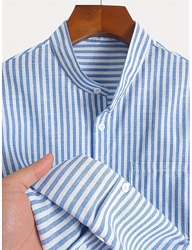 Herren Hemd Leinenhemd Kleidhemd Vertikale Streifen Täglich Outdoor Schwarz Weiß Kaki Hellhimmelblau Langarm Großvaterkragen Sommer Frühling Bekleidung Knöpfe