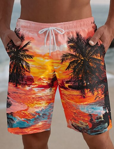 Herren Kokospalme Sonnenuntergang Meereswellen Badehosen Badeanzüge Badeshorts Boardshorts Mittlere Taille Hawaiianisch Strandurlaub Seitentaschen Netzfutter Elastischer Kordelzug in der Taille