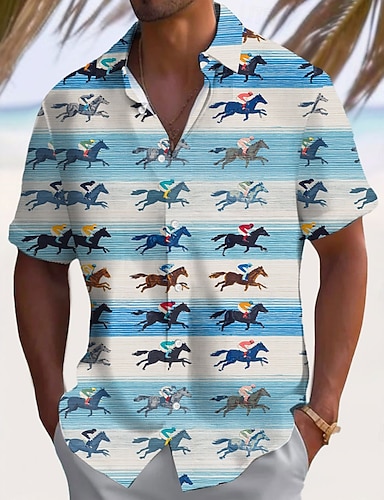 Kentucky Derby Herren Gestreift Farbverlauf Pferderennen Hemd Sommerhemd Knopfhemd Kurzarm Vintage-Retro Ferien Sommer Frühling Umlegekragen 3D-Druck Hemden mit Kragen Blau Weiß Grün Hellblau