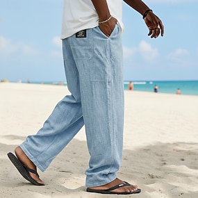 Herren Leinenhosen Sommerhose Baggy-Hosen Kordelzug Elastischer Bund Gerader Schnitt Einfach Komfort Atmungsaktiv Volle Länge Lässig Täglich Strand Urlaub Mode Blau Schwarz Unelastisch