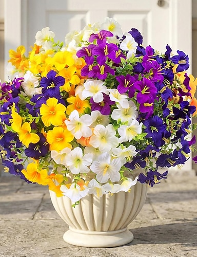16 künstliche Petunien für den Außenbereich, UV-beständige künstliche Petunienpflanzen, realistische Seidenblumen für Veranda, Haustür, Garten, Fenster, Außendekoration (16, weiß, gelb, lila,