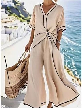 Damen Overall Aktiv Gestreift Kurzarm Weites Bein V Ausschnitt Tasche Täglich Urlaub Normale Passform Aprikose Sommer