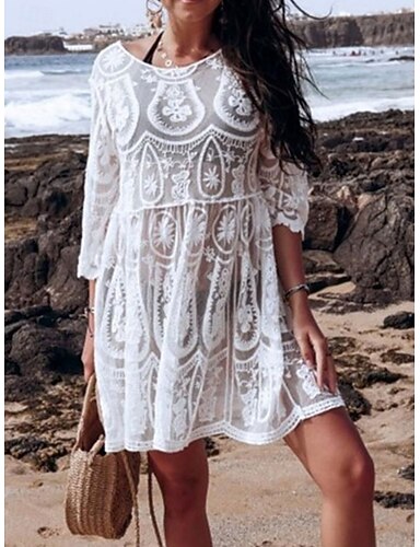 Damen Badeanzug Überwurf Badeanzugkleid Bademode Spitze Urlaub Strandbekleidung Einfarbig Rundhals Kurze Ärmel Badeanzüge