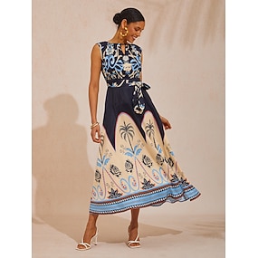 Damen Freizeitkleid Maxikleid Schwarz Ärmellos Blätter Frühling & Sommer Runden Alltagstauglich Strandurlaub S M L