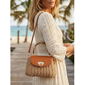 Vintage-Strohhandtasche für Damen mit Bambusgriff, Lederklappe, verstellbarem Riemen, ideal für Strandurlaub und Alltag, in verschiedenen Farben erhältlich