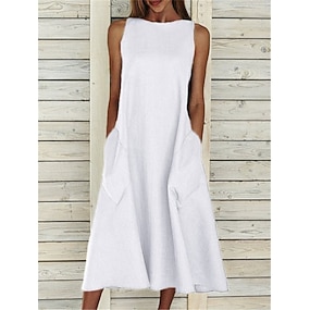 Damen Midikleid ärmellos Taschen lässig A-Linien-Silhouette runder Ausschnitt weiß sommerlich vielseitig normale Passform bequem leicht atmungsaktiv Kleidung