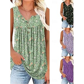 Damen Bluse Knöpfe Druck Blumen Lässig Ärmellos V Ausschnitt Lange Oberteile Täglich Ferien Schwarz Hellgrün Himmelblau Violett Purpur Sommer Frühling