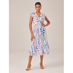 Damen Freizeitkleid Regenbogen Kurzarm Tupfen Rüsche V Ausschnitt Urlaub XS S M