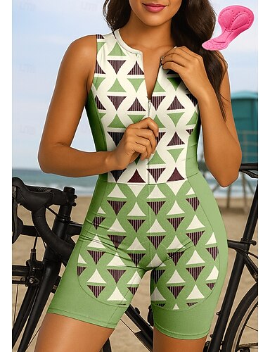Damen Triathlonanzug Radtrikot-Set Ärmellos Sommer Grün Geometrisch Fahhrad 3D-Polster Schnelltrocknend UV-beständig Frontreißverschluss Reflektierende Streifen Sport Bekleidung