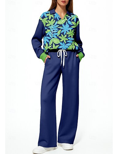 Damen Sweatshirt Trainingsanzug 2-teiliger Trainingsanzug Kordelzug Tasche Blumen Sweatshirt und Hose Sportbekleidungsset Kombination Herbst Winter Blau Berufung Outdoor Reise Leicht Mode Langarm