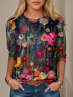 Damen T-Shirt Crew Neck Langarm Tunika Ölmalerei Blumen Lässig Regulär Tops Daily Print Schwarz Frühling Herbst