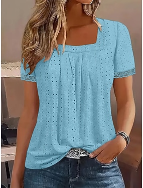 Damen T Shirt T-Shirt Lochmuster Einfach Mode Stilvoll Klassisch Kurzarm Quadrathals Normale Oberteile Lange Oberteile Täglich Ausgehen Wochenende Blau Purpur Sommer Frühling