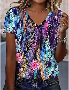 Damen T Shirt Druck Blumen Grafik Vintage Stilvoll Klassisch Kurzarm V Ausschnitt Normale Oberteile Täglich Sport Ausgehen Blau Rosa Purpur Beige Sommer Frühling