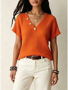 Damen Textur Bluse Waffel T-Shirt Stilvoll Klassisch Kurzarm V Ausschnitt Normale Oberteile Lässig Täglich Strand Schwarz Orange Sommer Frühling