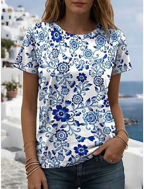 Damen T Shirt Druck Blumen Grafik Musik Vintage Stilvoll Klassisch Kurzarm V Ausschnitt Normale Oberteile Täglich Sport Ausgehen Blau Weiß Sommer Frühling Herbst