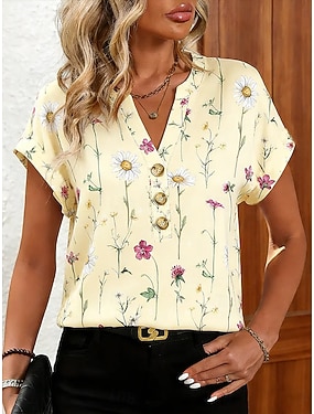 Damen 3D-Print Boho T-Shirt Grafik Pflanzen Elegant Bohemia Vintage Halblangarm V-Ausschnitt Reguläre Tops Täglich Ausgehen Wochenende Schwarz Gelb Pink Lila Rosarot Sommer Frühling