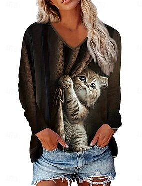 Damen T Shirt Druck Grafik Tiermotiv 3D Vintage Stilvoll Klassisch Langarm V Ausschnitt Normale Oberteile Täglich Braun Herbst Winter