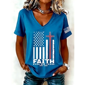 Amerikanischer Unabhängigkeitstag Damen T Shirt Druck Grafik Flagge Vintage Stilvoll Klassisch Kurzarm V Ausschnitt Normale Oberteile Täglich Wochenende Urlaubskleidung Blau Rote Grün Sommer Frühling