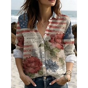 Amerikanischer Unabhängigkeitstag Damen Hemd Satinhemd Durchgeknöpft Hemd Freizeithemd Druck Blumen Grafik Amerikanische Flagge Bohemien Vintage Mode Langarm Hemdkragen Normale Oberteile Täglich