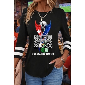 Weltfußballspiel 2026 Damen T-Shirt Print Grafik Fußballteam Vintage Mode Stilvoll Langarm Rundhals Reguläre Oberteile Tägliche Wochenende Blau Schwarz Rot Grün Frühling Herbst Winter